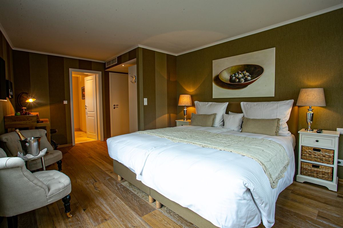 Gemütliches, modernes Doppelzimmer, ausgestattet mit Safe, Minibar, TV, Eichenholz-Parkett, Box-Springbett und Naturstein-Bad mit geräumiger Regen-Dusche.