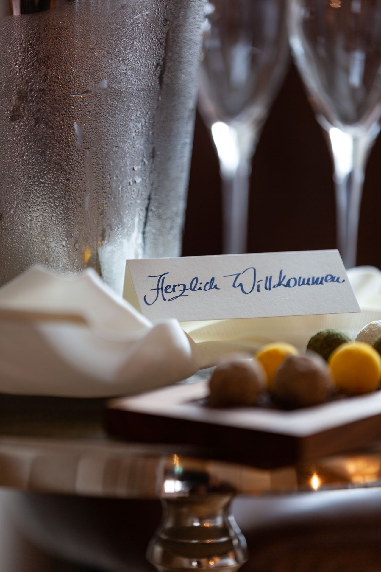 - Sherry-Karaffe und Obstteller auf dem Zimmer